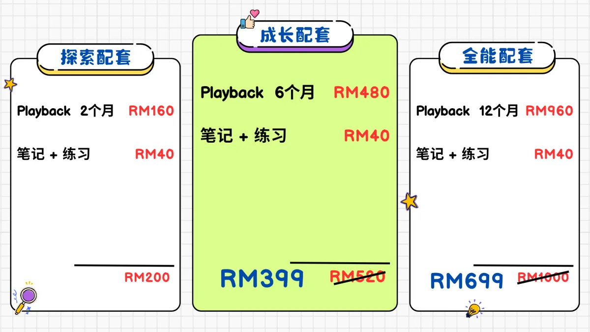 - 成长配套(6个月): 只能选择 上半年 或 下半年 的重播影片内容